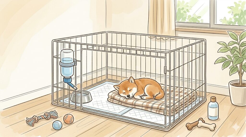ケージまたはサークルは、子犬の避難場所・寝床・トイレスペースを兼ねる重要なアイテムです。