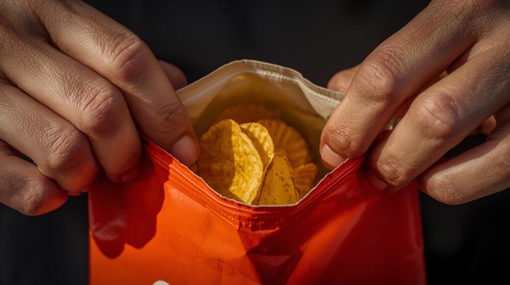 私はそっと棚からお菓子の袋を取り出し、できるだけ静かに開けようとした。