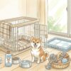 ケージに入れて、ペットシーツを敷いて、水飲み器をセットして。
